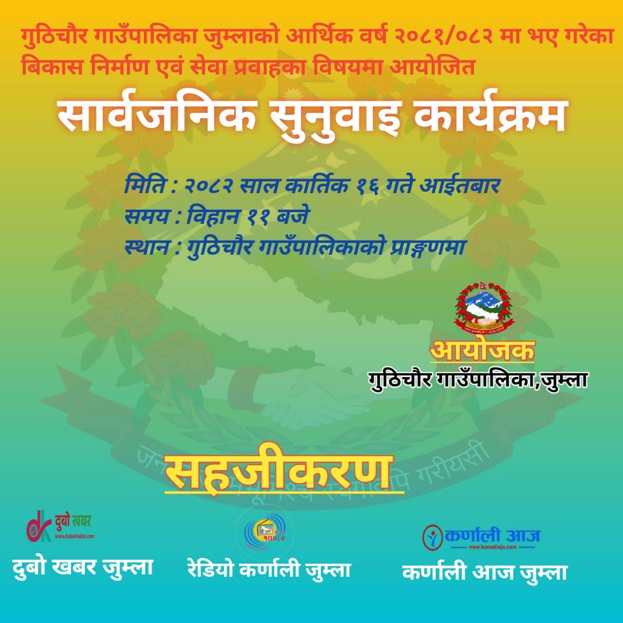 गुठिचौर गाउँपालिका नेपालको संविधानको धारा २९५ उपधारा ३ बमोजिम कायम भएका गाउँपालिका तथा नगरपालिकाहरु मध्येको एक स्थानीय तह हो। कर्णाली प्रदेश अन्तर्गत जुम्ला जिल्लामा पर्ने गुठिचौर गाउँपालिका साविकका देपालगाउँ , गोठिचौर र गर्ज्याङ्गकोट गरी ३ गा.वि.स. हरु मिलेर बनेको छ। करिब ४२७ वर्ग कि.मि. क्षेत्रफलमा रहेको यस गुठिचौर गाउँपालिकाको जनसंख्या २०७८ सालको जनगणना अनुसार जम्मा जनसंख्या १०९२२ रहेको छ। जसमध्ये महिलाको संख्या ५५३८ र पुरुषको संख्या ५३८४ रहेको छ। वडागत रुपमा हर्ने हो भने वडा नं.