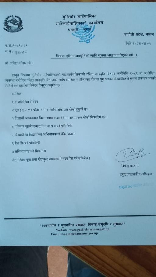 दलित छात्रवृतिको लागि सुचना आहान गरिएको बारे