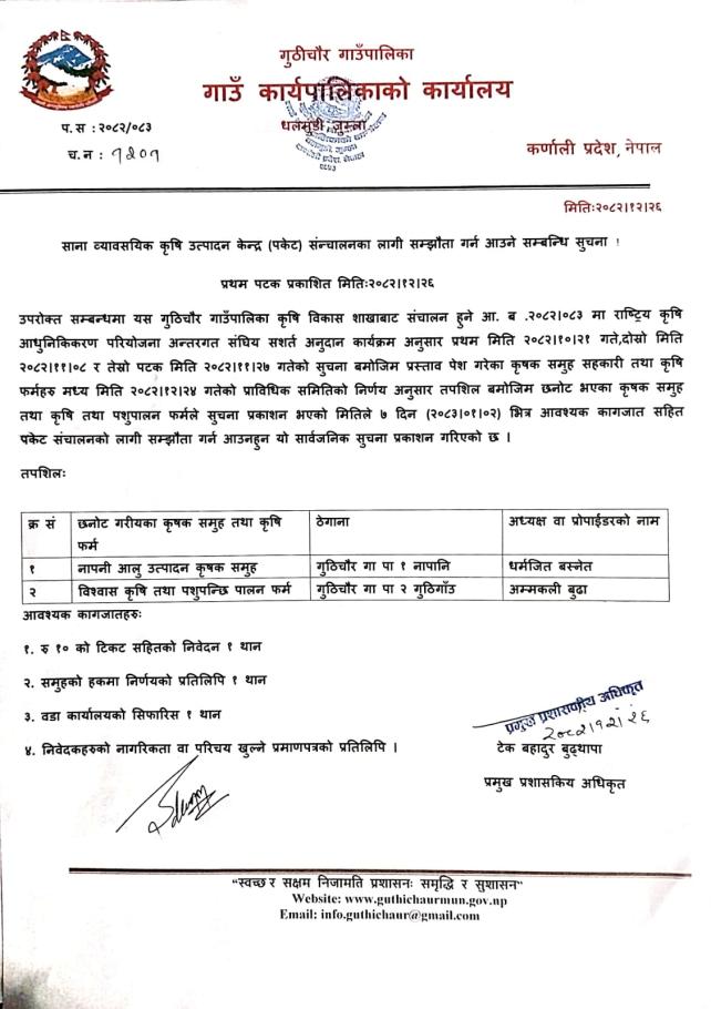 साना व्यावसयिक कृषि उत्पादन केन्द्र (पकेट) संन्चालनका लागि सम्झौता गर्न आउने सम्वन्धि सुचना ।